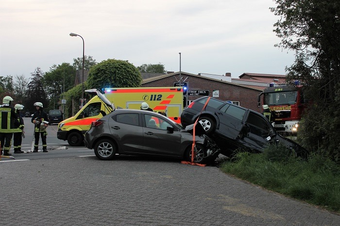 Auf der Tom-Brook-Straße/Ecke Moorhuser Dorfstraße kollidierten ein VW Golf und ein Mazda vor einer Diskothek. Die Feuerwehren unterstützten vor Ort den Rettungsdienst bei der Rettung der insgesamt drei Verletzten Personen aus den Fahrzeugen. Glücklicherweise befand sich keine der verunfallten Personen in einer eingeklemmten Lage, sodass die beiden übereinandergeschobenen Fahrzeuge lediglich vor einem Verrutschen gesichert werden mussten. Weiterhin stellte die Feuerwehr den Brandschutz sicher und sperrte die Tom-Brook-Straße für die Dauer des Einsatzes voll. Die Verletzten wurden durch den Rettungsdienst in umliegende Kliniken gefahren und die Unfallfahrzeuge durch zwei Abschleppunternehmen abtransportiert.